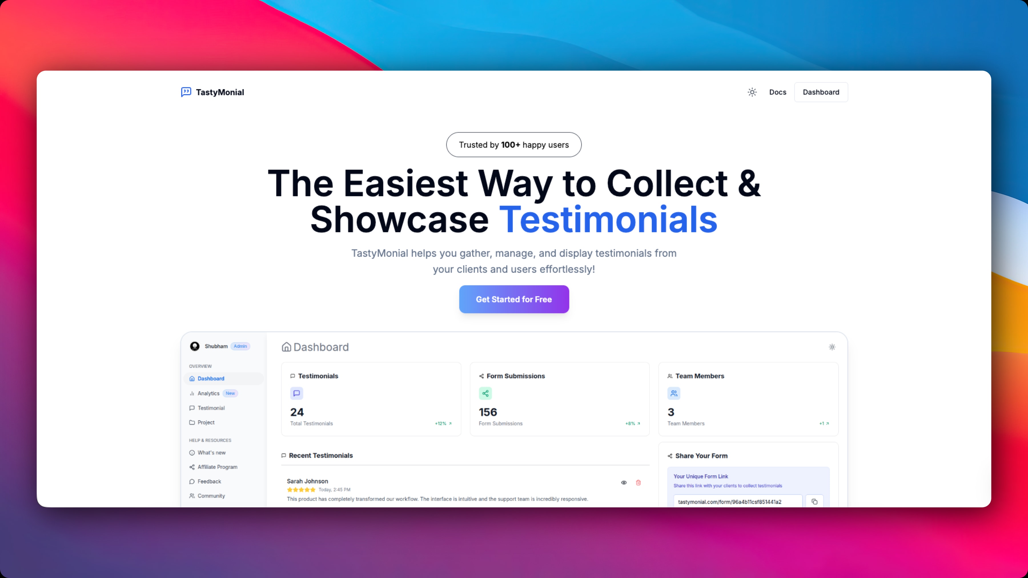 A testimonial collection tool that helps you gather and showcase customer feedback. Features easy integration with your website, customizable testimonial display, support for video and audio testimonials, analytics dashboard to track engagement, and GDPR compliance.